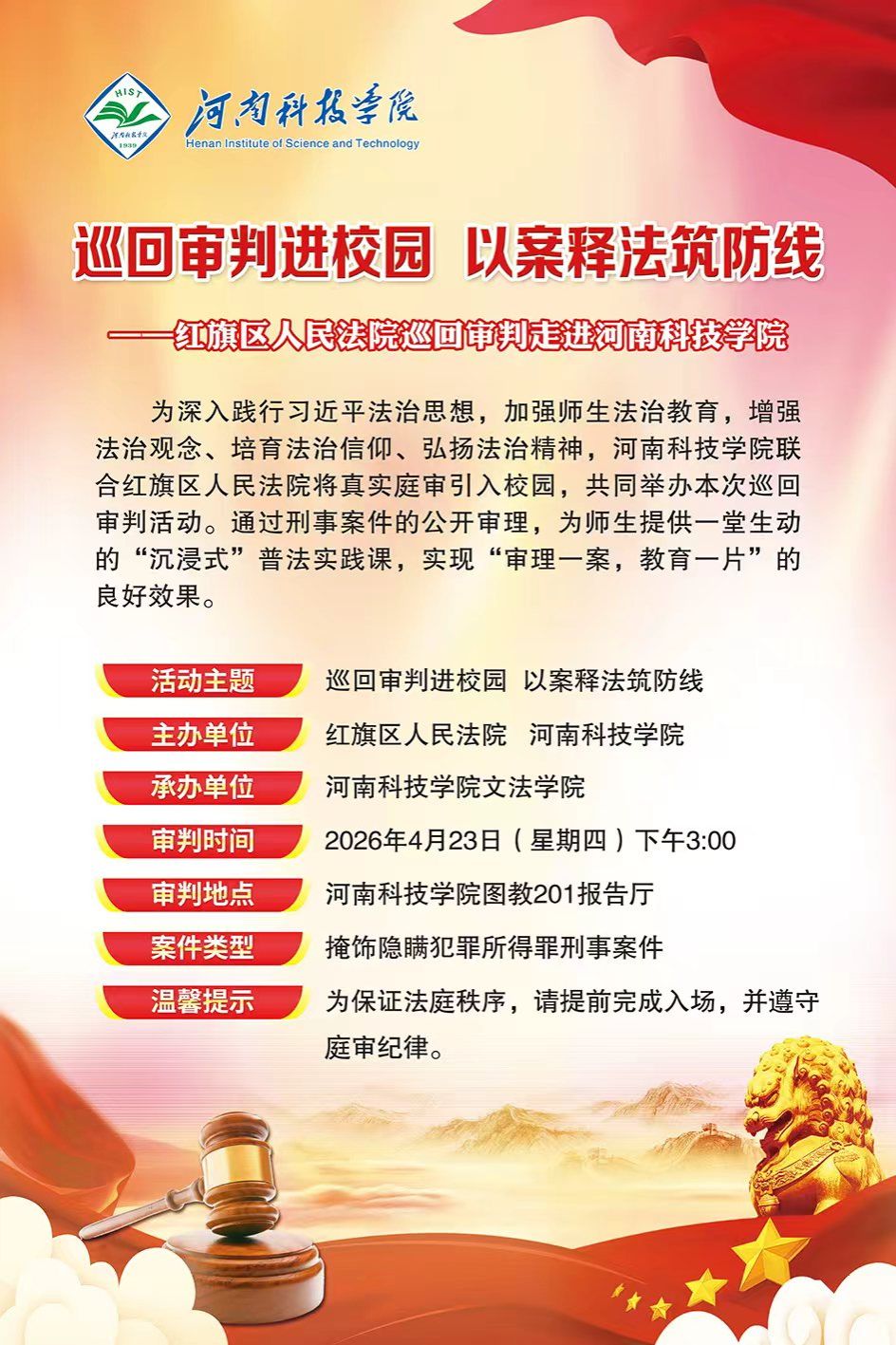 巡回审判进校园 以案释法筑防线——红旗区人民法院巡回审判走进河南科技学院