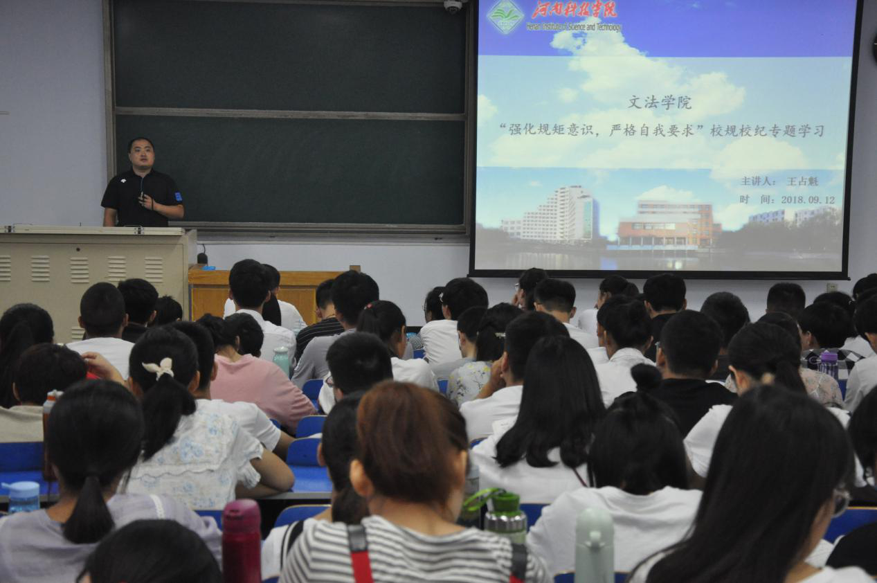 为帮助大一新生尽早熟悉学校规章纪律条例及学籍管理相关规定,提前做好大学学习生活规划,9月12日上午,文法学院在三合一教室开展“强化规矩意识,严格自我要求”校规校纪专题讲座,讲座由团委老师王占魁主讲,2018 级全体学生参与此次会议。