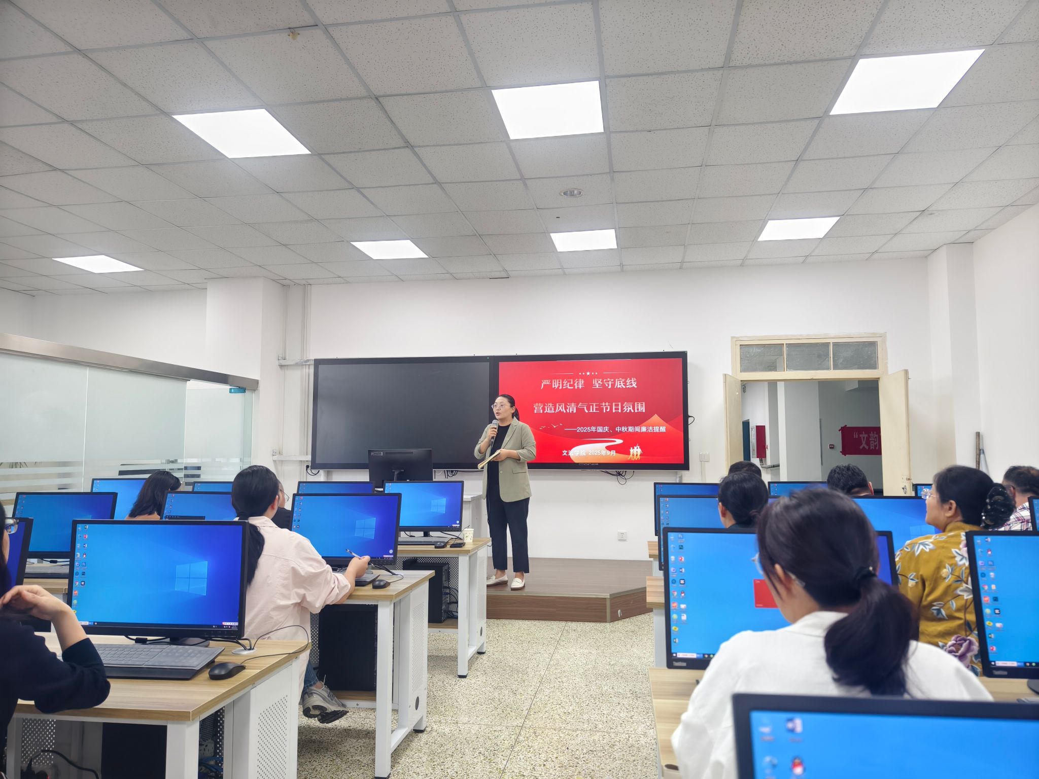 会上,田甜以《严明纪律 坚守底线 营造风清气正节日氛围》为题,强调“廉洁是教育工作的生命线”,要求全体教职工时刻绷紧廉洁之弦,要严格遵守《新时代高校教师职业行为十项准则》,规范工作流程,确保财务报销、物资采购等环节公开透明,严禁收受学生及家长礼品礼金等行为,廉洁过节、节俭过节,以健康向上的方式团聚、庆祝,自觉维护风清气正的节日氛围。