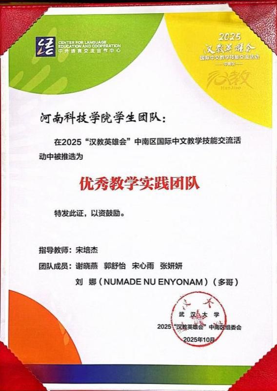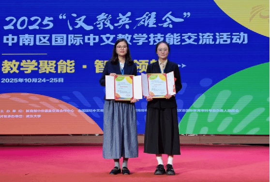 2025年10月24日至25日,由武汉大学主办的“汉教英雄会”中南片区国际中文教学技能交流活动顺利举行。文法学院派出由宋培杰教授指导的代表队参赛,成员包括研究生郭舒怡、谢晓燕、宋心雨,本科生张妍妍以及留学生刘娜。该团队与来自广东、广西、湖南、湖北、河南等中南地区高校的32支师生队伍同台竞技,深入交流,最终荣获“优秀教学实践团队”奖。