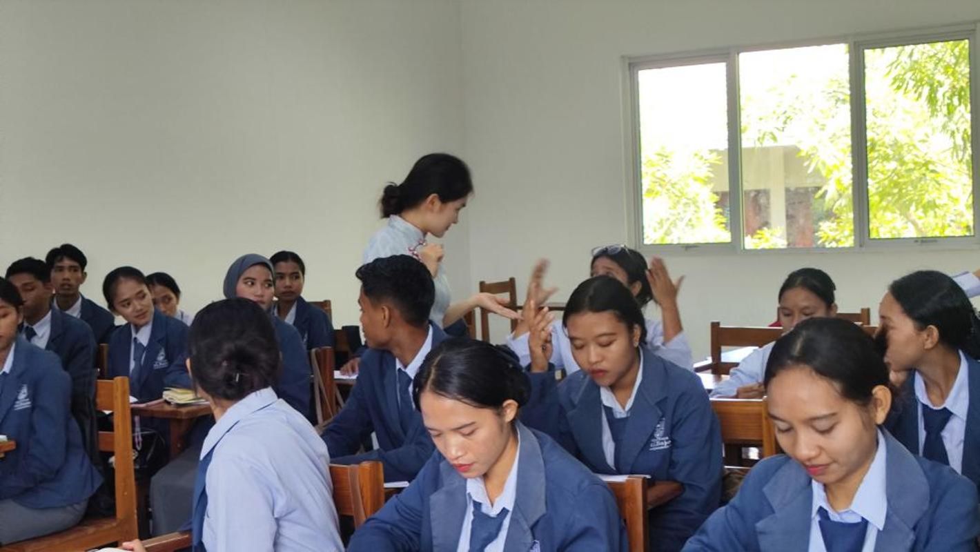 我实习的学校为Poltek eLBajo Commodu大学,是当地唯一一所高校。汉语课覆盖4个专业5个班的学生,一周12节课的节奏充实而忙碌。17-25岁的学生和我年龄相仿,课上会踊跃举手、抢着回答问题,课下会追着用中文说“老师好”,且每节课结束都会围过来道声“谢谢”。